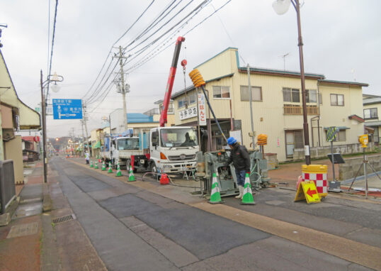 【管路DB整備事業】推進工 マシンを方向転換して新たなスパンを推進します。 ホームUncategorized タグ: Uncategorized 最近の出来事 最近の現場 2025-07-08 先導体を人孔(マンホール)内より4分割に分解して回収し、再度整備し組立、推進装置架台を方向転換して新たな推進工の準備をします。 先導体を設置後、鏡切りし薬液注入の効果・土質(礫および玉石形状)を確認し、推進を開始します。SUSカラー付直管(φ300 長さ1.0m)を接続しながら到達をめざします。到達後は、先導体を人孔回収しケーシング撤去後、推進装置架台等を撤去して完成です。片付け、清掃し立坑内はきれいになりました。 投稿者 dev-email@wpengine.local 関連投稿 タグ: Uncategorized 【管路DB整備事業】改良型伏越工の施工箇所に地盤改良のための、薬液注入工を施工中です。 2025-12-06 すべて読む タグ: Uncategorized 最近の現場 住宅を解体しています。 2025-11-28 すべて読む タグ: Uncategorized 最近の出来事 最近の現場 【管路DB整備事業】役場庁舎前の路線 地下水との水替えに苦戦しながら、布設・設置しています。 2025-09-17 すべて読む タグ: Uncategorized 最近の現場 【管路DB整備事業】下流域の推進完了しました。 2025-09-17 すべて読む タグ: Uncategorized 最近の出来事 最近の現場 【管路DB整備事業】下流域を推進しています。 2025-08-01 令和元年 施工済みの既設鋼製ケーシング立坑を... すべて読む タグ: Uncategorized 最近の出来事 最近の現場 『春日八郎おもいで館』のトイレ外壁他を改修しました。 2025-08-01 春日八郎おもいで館改修工事(町 発注) すべて読む 投稿ナビゲーション 前の投稿次の投稿